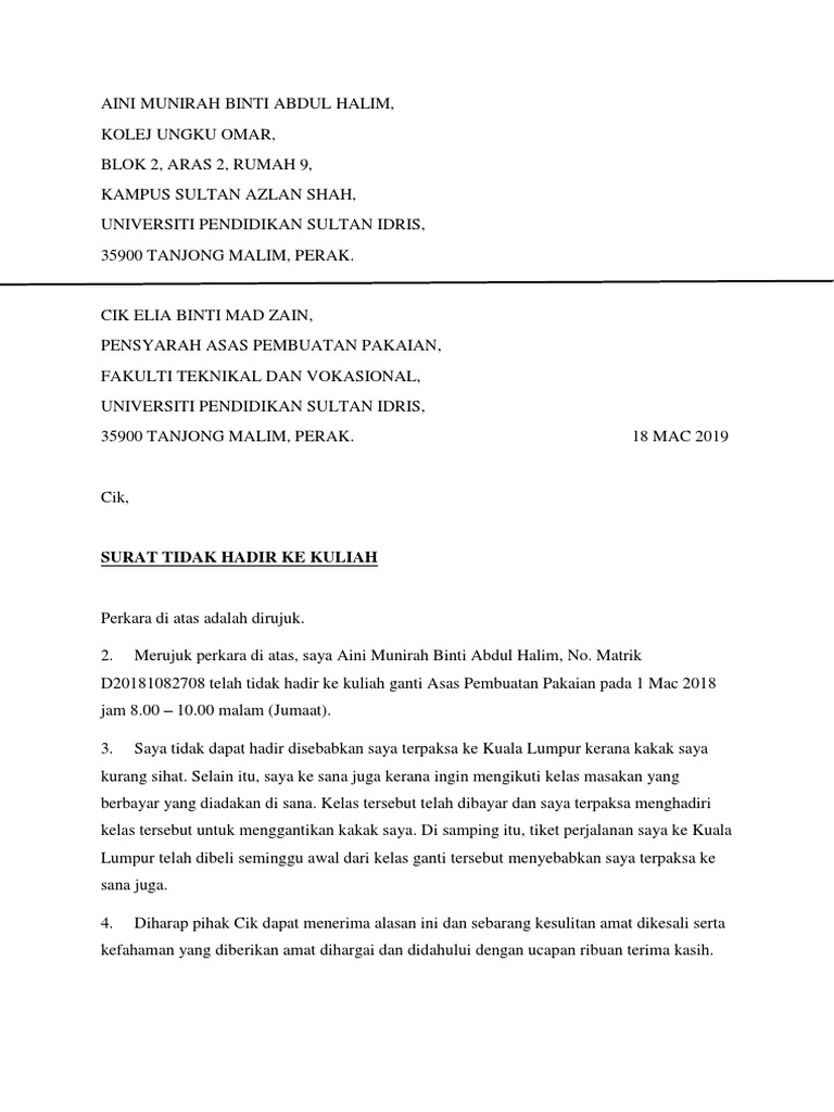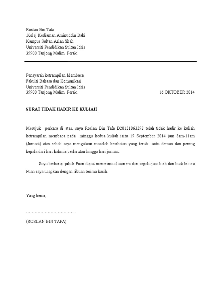 Example Surat Rasmi Tidak Hadir Ke Kuliah Pdf